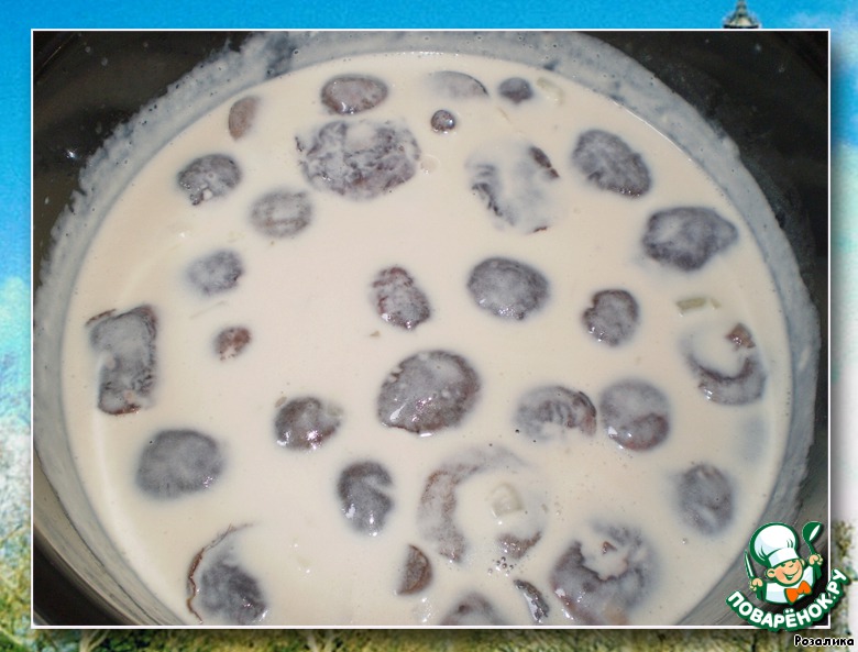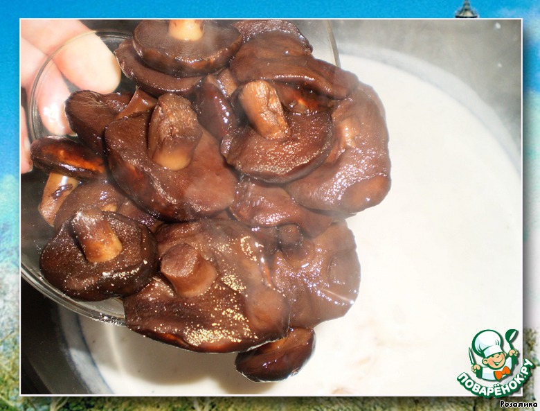Если грибы большие, нарезаем так, как вам нравится, маленькие оставляем целиком. Грибы выкладываем в молочный бульон, добавляем соль, перец, мускатный орех (кто любит), делаем маленький огонь и варим 10-12 минут.