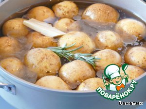 Добавить бульон (бульон должен покрывать картофель на 3/4), веточку розмарина, оливковое и сливочное масло, соль.