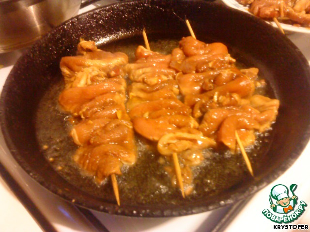 Шашлычки положить на раскаленную, смазанную маслом сковороду и обжарить на среднем огне по 4 мин. с каждой стороны