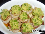 Выложить смесь на медальоны и запекать в духовке при функции "гриль" или на максимуме 5-8 минут (до румяности "шапочки")