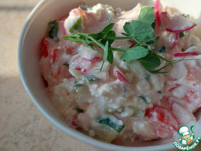 Творог растереть со сметаной, посолить и поперчить, смешать с овощами. -