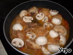Шампиньоны тоже режем достаточно крупно, добавляем в нашу сковородочку и тушим еще 10 минут.