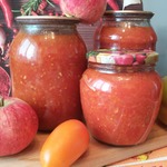 Помидоры, перец, морковь и яблоки пропустить через мясорубку. И смешав, варить, помешивая, 2 часа на медленном огне.