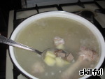 По истечении этого времени добавить нарезанный кубиками картофель, нашинкованный репчатый лук, посолить и довести до готовности.