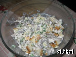 В майонез выдавливаем чеснок на чеснокодавилке (за неимением оной я его мелко крошу ножом) и рубленую зелень (у меня петрушка). Получившимся соусом заправить салат, добавить сухарики из белого хлеба и перемешать. Дать настояться около часа.