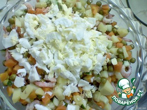 Отварить до готовности картофель, морковь и яйца. Нарезать всe кубиками: морковь...