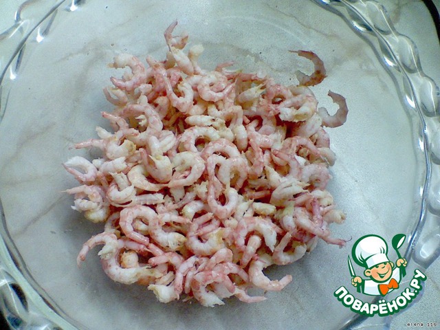 Отварить креветки с добавлением лаврового листа и нескольких горошин душистого перца. Очистить.