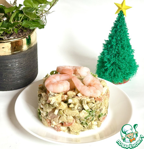 Стандартный салат "Оливье", но с креветками и оригинальной заправкой. Думаю, что никого не удивлю этим салатом и "не открою Америки". Но... Делаю подобный салатик часто, нам он очень нравится. Буду рада, если кому-то он тоже понравится.