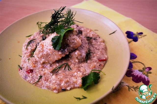 Подаем горячим, полив соусом и украcив кусочками белка.