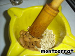 Готовим соус: в ступке толчем подсушенные орешки, добавляем кусочек обжаренного хлеба,