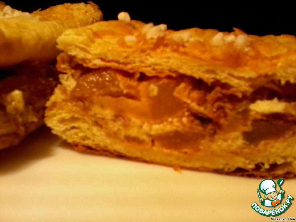 • Когда заготовки из слоеного теста остынут, промазать 6 из них кремом и накрыть оставшимися 6 (которые были украшены сахаром).