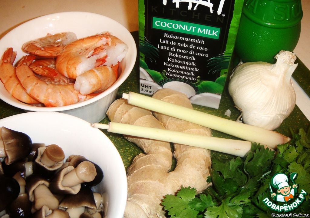 Второе, я не специалист в тайской кухне, но мне кажется сначала нужно варить креветки и все остальное в кипятке, а потом добавить кокосовое молоко. Когда я варила супчик Том Кха, то молоко от долгого кипения свернулось. А может это было от лимона?!?