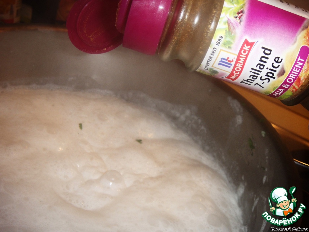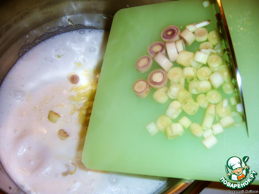 Выливаем в кастрюлю кокосовое молоко, доводим его до кипения и, убавив огонь, добавляем натёртый корень имбиря, рубленый чеснок и нарезанную кольцами лимонную траву.