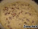 Кефир, яйца, сметану, соль размешать, влить молоко, добавить 1 стакан изюма и еще хорошо размешать, поставить на огонь.