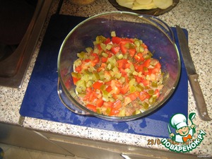 Следующий слоЙ: нарезанные помидор и соленый огурец