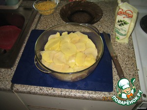 Выложить картофель, нарезанный кружочками, посолить и поперчить