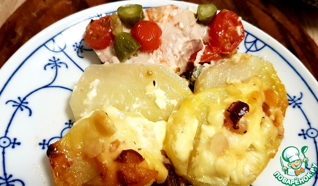 Очень вкусное и легкое в приготовлении блюдо, которое мы делаем на праздники и в обычные дни. А когда звонят друзья и грозятся приехать через несколько часов - выручает!!! Не надо стоять у плиты: жарить, парить..., а просто закинула слоями продукты - и можно заняться собой, любимой. А родился у меня этот рецепт случайно, когда оказалось, что в холодильнике осталось всего понемногу, а хотелось вкусненького...