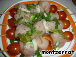 нанизываем на шпажки, чередуя с кусочками лука, красного и зеленого перца, помидорчиками, посыпаем зеленью, специями и оставляем в холодильнике на 20-30 мин.