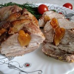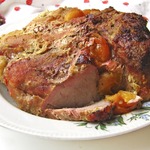 Разрезы натираем солью, перцем, горчицей и чесноком. Вставляем в каждый по 3 ягоды урюка.