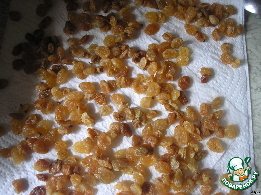 Изюм замочите в горячей воде на несколько минут. Промойте, обсушите на салфетке.