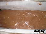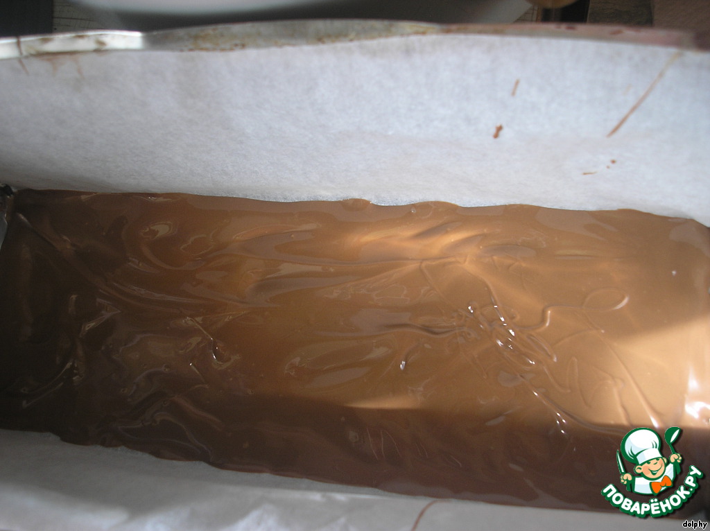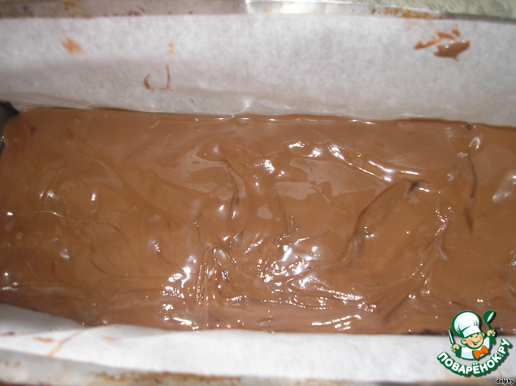 Шоколад вылейте и равномерно распределите по дну подготовленной формы. Уберите на 20 минут в холодильник, чтобы застыл.