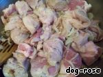 • Добавляем к нему нарезанное довольно мелкими кусками мясо, обжариваем.