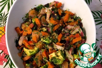 Морковь, свеклу, 1/2 мелко нарезанной сельди, часть белка и желтка и репчатый лук перемешиваем с майонезом.
