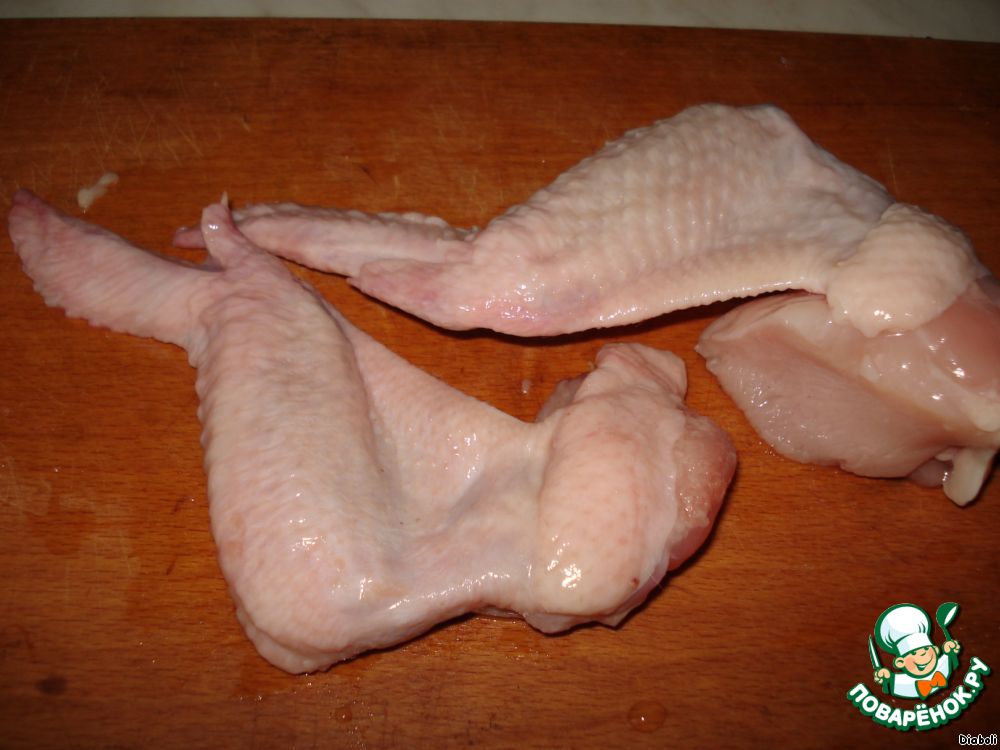 Берем два куриных крылышка, хорошенько промываем и выкладываем на разделочную доску.