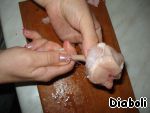 Берем одну из "частей", надрезаем с одного бока кожу и "стягиваем" мясо к противоположному краю.