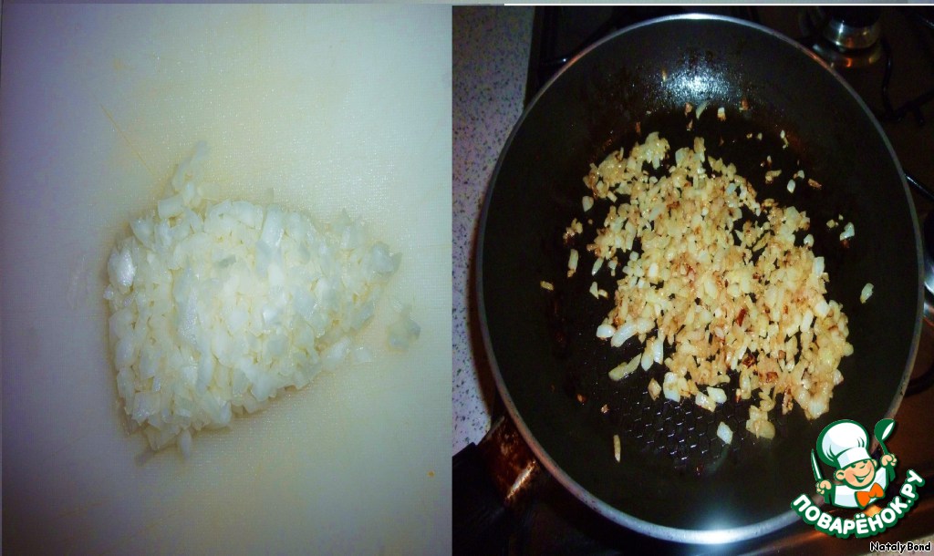 Режем 1 луковицу, обжариваем до золотистого цвета