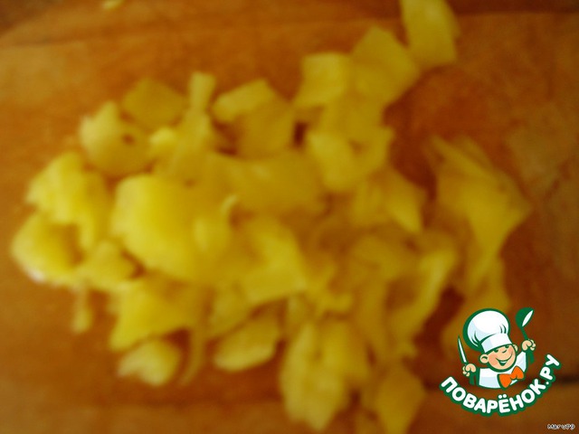 Фрукты (ананасы) порежьте кусочками и добавьте в тесто. Все перемешайте.
