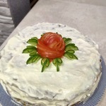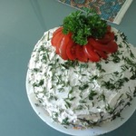 Таким образом промазываем все блинчики, выкладывая их один на другой в виде торта. Последний блин смазываем только творожным кремом, посыпаем зеленью и украшаем кусочками помидорок.