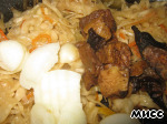 Квашеную капусту при желании промываем, но я люблю кислую, поэтому промывать не стала. Обжариваем капусту на жире, вытопленном от бекона. Добавляем лук и грибы, они у меня уже готовые отваренные (замороженные).