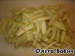 Баклажан почистить, нарезать маленькими брусочками, замочить в воде с солью, дать постоять