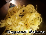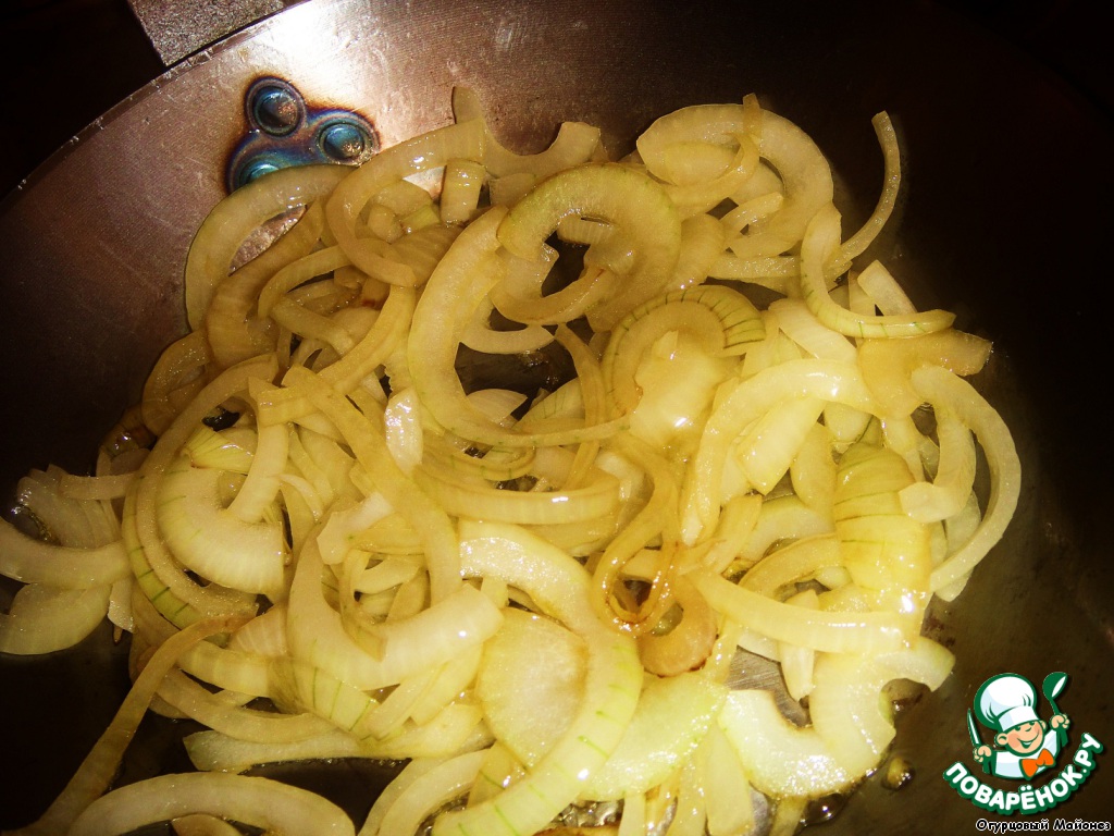 Лук режем полукольцами и обжариваем на растительном масле до золотистого цвета.