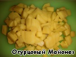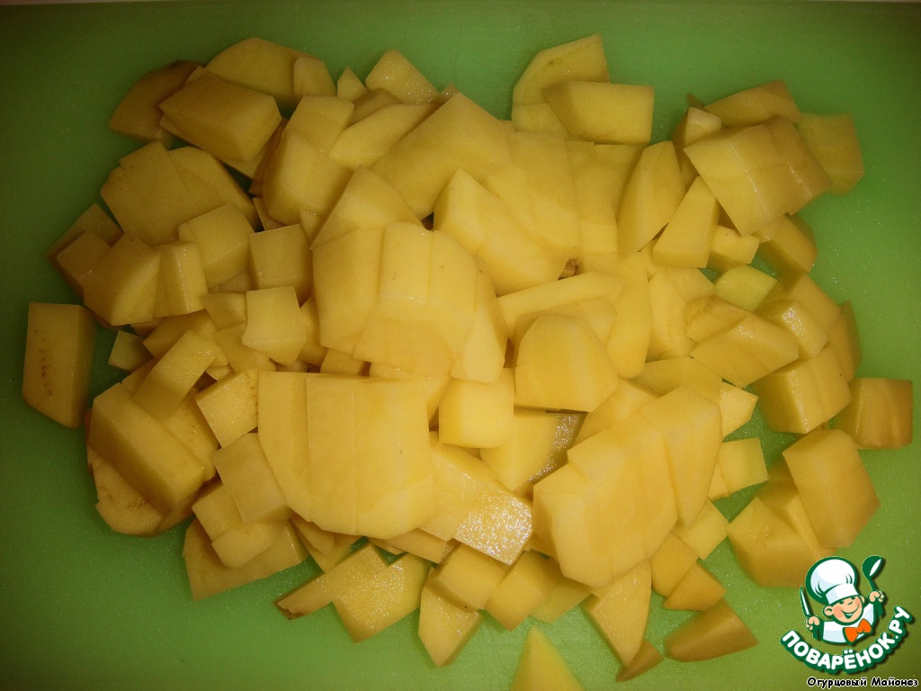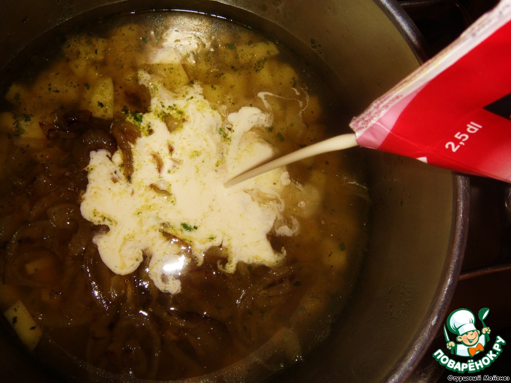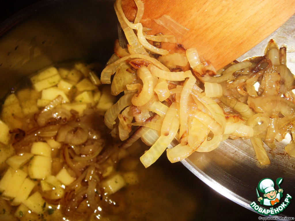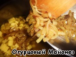 В кастрюлю наливаем пол-литра воды, добавляем бульонный кубик, туда же кладём картофель и обжаренный лук.