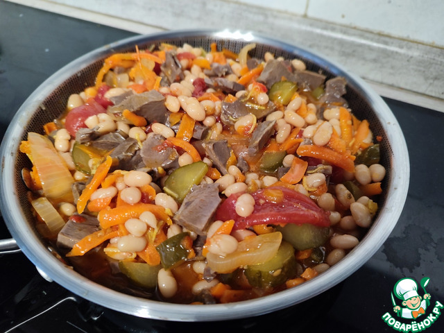 Отварную фасоль добавляем в сковородку к сердцу и тушим ещё минут 15.