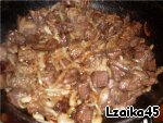 Обжариваем с нарезанным полукольцами луком, до золотистого цвета...