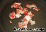 А пока что займёмся беконом. Режем его на маленькие тонкие ломтики и обжариваем на сковороде (уже без добавления масла).