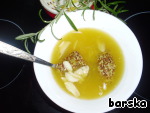 Для маринада выдавить сок 2 апельсинов и добавить чеснок, нарезанный тонкими пластинками, горчицу и веточку розмарина