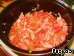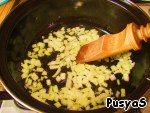 К луку добавляем мясо, черный перец, вливаем немного воды и тушим до испарения жидкости.