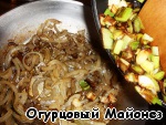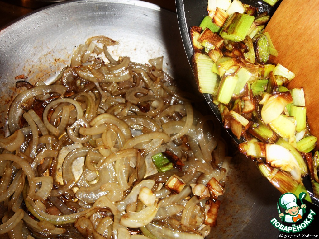 У оставшегося количества лука-порея удаляем зелёную часть, а белую нарезаем колечками, обжариваем на сливочном масле и смешиваем с обжаренным ранее репчатым луком.