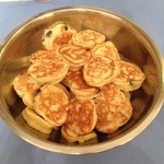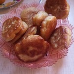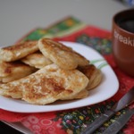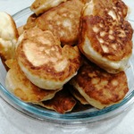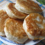 Я жарила оладьи на такой сковороде, мне нравится, что края оладьев получаются ровненькими. Чтобы тесто не прилипало к ложке, каждый раз, выкладывая его на сковороду, окунать ложку в холодную воду. А чтобы оладьи не впитывали в себя много жира, я смазывала сковороду кисточкой, макая её в растительное масло.