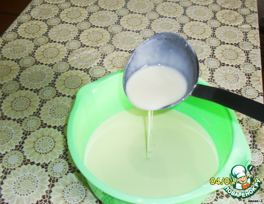 Добавить муку (тесто должно быть жидким). Хорошо взбить. Оставить готовое тесто на 20 мин. отдохнуть. -