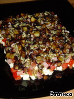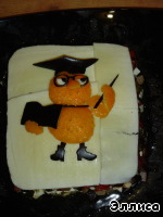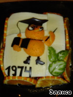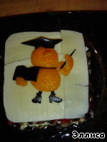 Произошла эта история давным-давно, когда я училась в шестом классе. В наши времена детей училось много и, соответственно, не хватало кабинетов, чтобы все учились в одну смену, поэтому занятия у нас начинались в час дня, да еще была кабинетная система, когда мы бегали из кабинета в кабинет. Это предисловие, а теперь по сути... Дело было осенью... Пришли мы к кабинету, в котором должен проходить последний урок, и ждем учителя. Валерий Иванович, наш учитель, подошел к кабинету, открыл дверь и .... замер у порога. Мы все ринулись к двери, чтобы узнать, что же произошло, а когда увидели эту картину, то дружно рассмеялись. А увидели мы вот что: на форточке сидел совенок и в одной лапке держал указку... Половину урока всем классом мы ловили "мудрого совенка", затем отнесли его в живой уголок, там он прожил до весны, а весной мы отвезли его в лес. Этот случай из школьной жизни помнят все мои одноклассники, и при встречах мы всегда вспоминаем нашего "мудрого однокашника"! Вот я и решила посвятить этот салат нашему необычному однокласснику. На конкурс "Вечер школьных друзей".