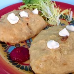 На смоченную водой ладонь кладем шарик из картофельного теста, разравниваем в форму лепешки и кладем в середину шарик фарша.