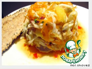 Капусту вынуть из морозилки и слить маринад. Аккуратно смешать все ингредиенты.