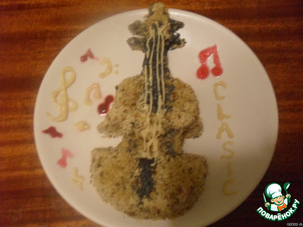 Достаём слегка застывшую массу из холодильника, выкладываем на блюдо, формируем в виде скрипки.