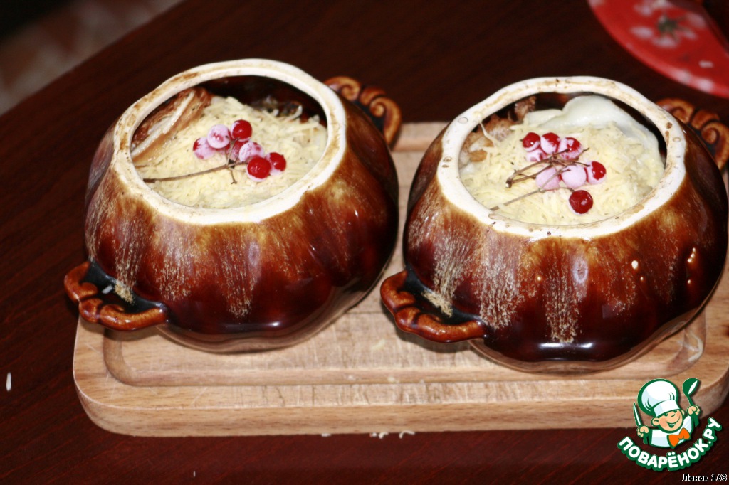 Мне очень нравится сочетание мяса с фруктами, вот и в этих горшочках, помимо мяса и овощей, есть и фрукты, и даже ягодный соус.. А также еще кое-что интересное.. На конкурс "Осеннее танго".