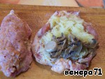 На отбивную выложить кабачок, грибы и свернуть рулетом. -